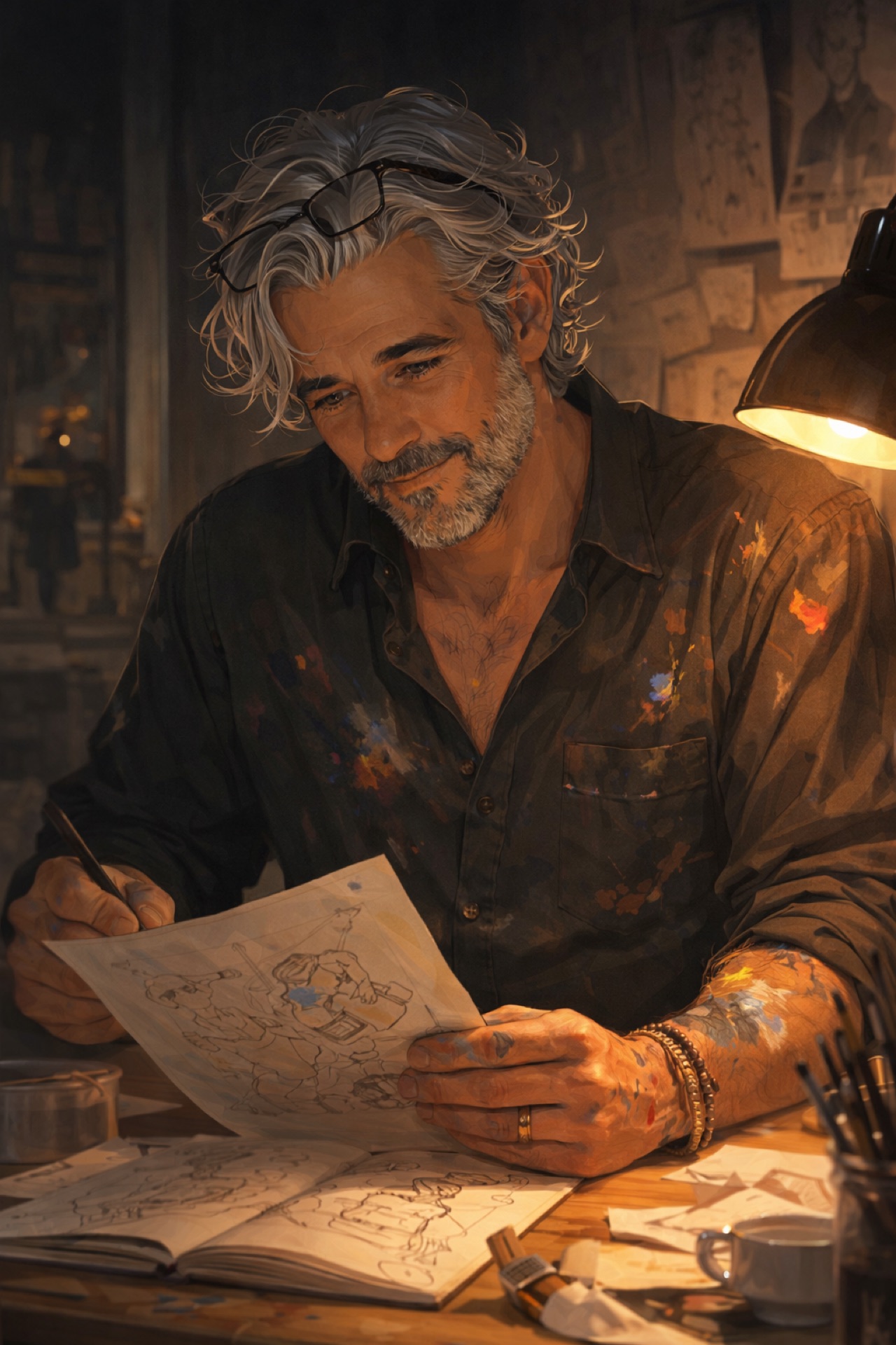 Early-to-mid forties. British. Six-foot-two, broad through the chest — combat-trained muscle softened by grief. Olive-tan skin weathered to warmth, sun-creased at the eyes. Mid-length dark brown curls threaded with early silver, Joel Miller chaos with poetic volume. A full beard trimmed rough, merging into the mustache without a break. Deep-set dark brown eyes that carry weight before they carry expression. Near-black in shadow, warm in lamplight.